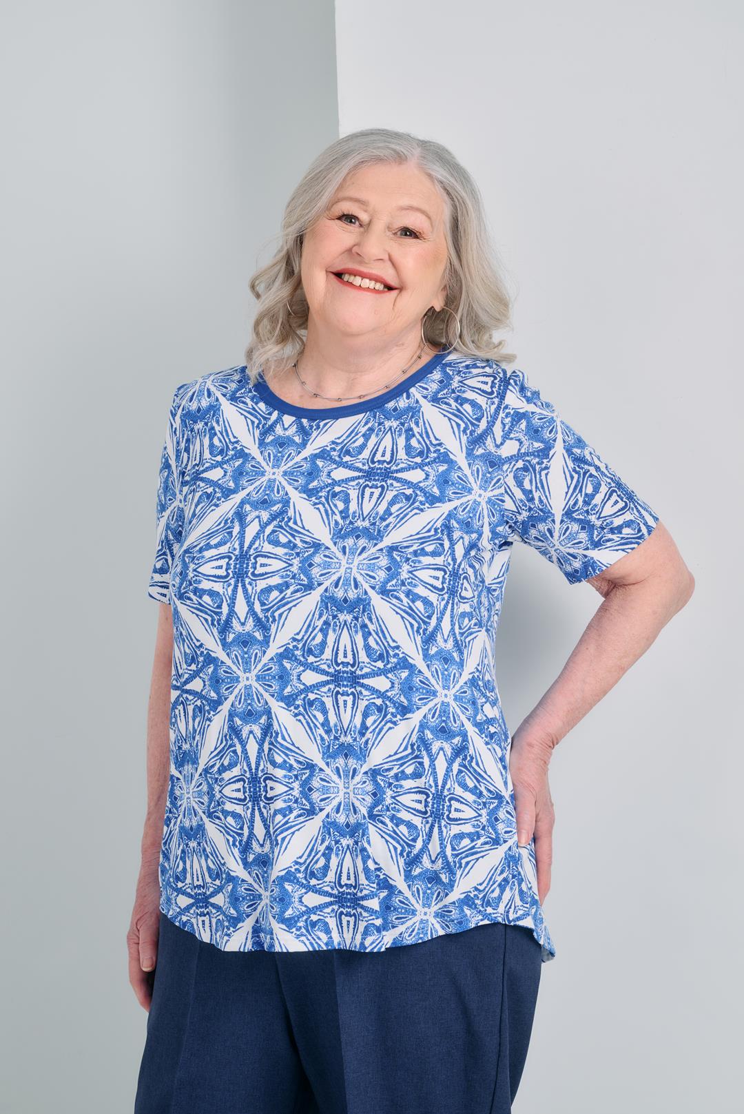 Our basic top short sleeves, with a round collar and light knit fabric for ultimate comfort. This top is perfect for everyday wear and comes in blue colors to suit your style. Stay comfortable and stylish with our basic t-shirt. This top is designed for individuals with reduced mobility, allowing it to be easily slipped on without lifting their arms or getting out of bed or a wheelchair. Polyester and spandex blend.