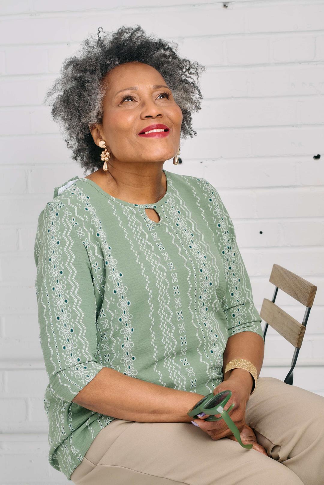 Haut style tunique. manches 3/4. Décolleté rond avec une jolie fente en forme de goutte. Le motif de broderie lui donne un aspect bohème. Ce vêtement possède un dos à double panneau qui s’ouvre complètement pour faciliter l’habillage des personnes qui reçoivent des soins quotidiens de base de la part de leurs aidants. 100 % polyester.