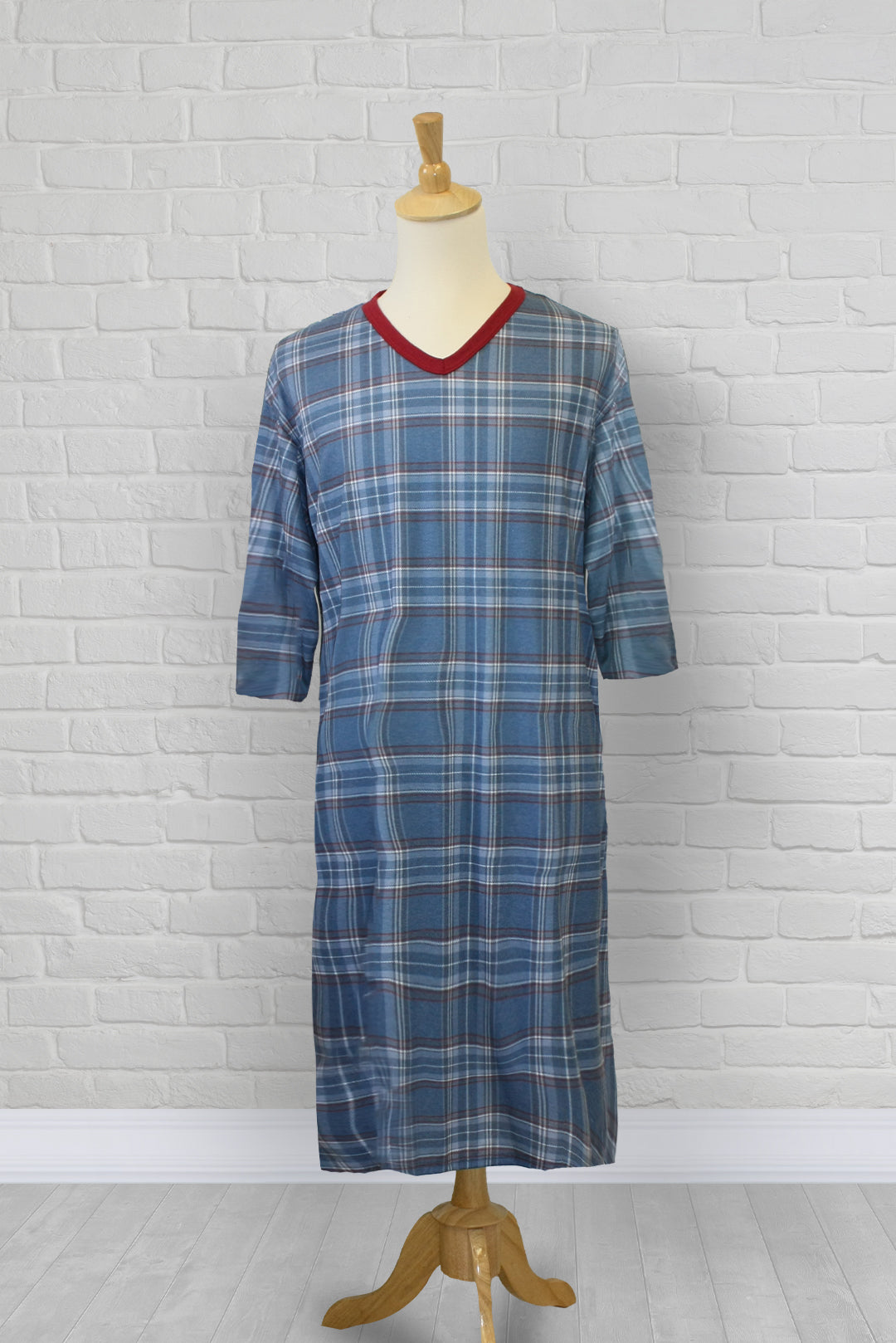 Experience ultimate comfort with our nightshirt for men. Made from soft knit this V-neck nightshirt features a lovely print. Transform your bedtime routine and indulge in a restful sleep with our premium nightshirt. Its design resembles that of a hospital gown. The large rear openings allow the garment to be put on without lifting the arms or twisting, ensuring the patient's comfort and facilitating the work of the nursing staff. 65% polyester and 35% cotton.