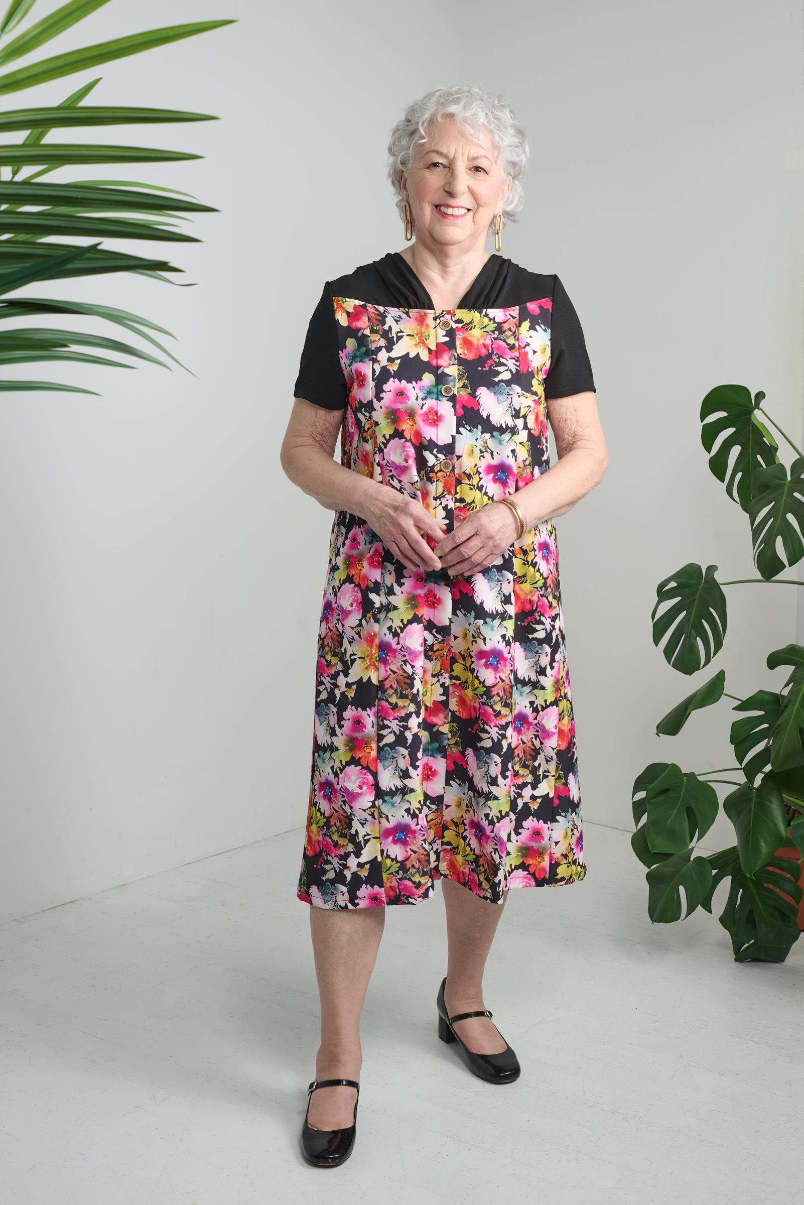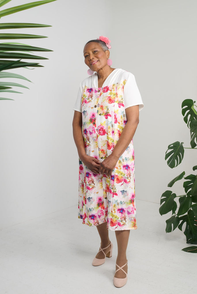 This adaptive dress has short sleeves and a lovely gathering detail at the shoulders to add charm. The bold flower prints and cutout add a touch of modern style. The fake buttoning gives the appearance of a traditional garment. Stay comfortable and stylish all day long. This product is designed for people with reduced mobility. You can put it on without leaving your bed or wheelchair. Polyester and spandex blend.