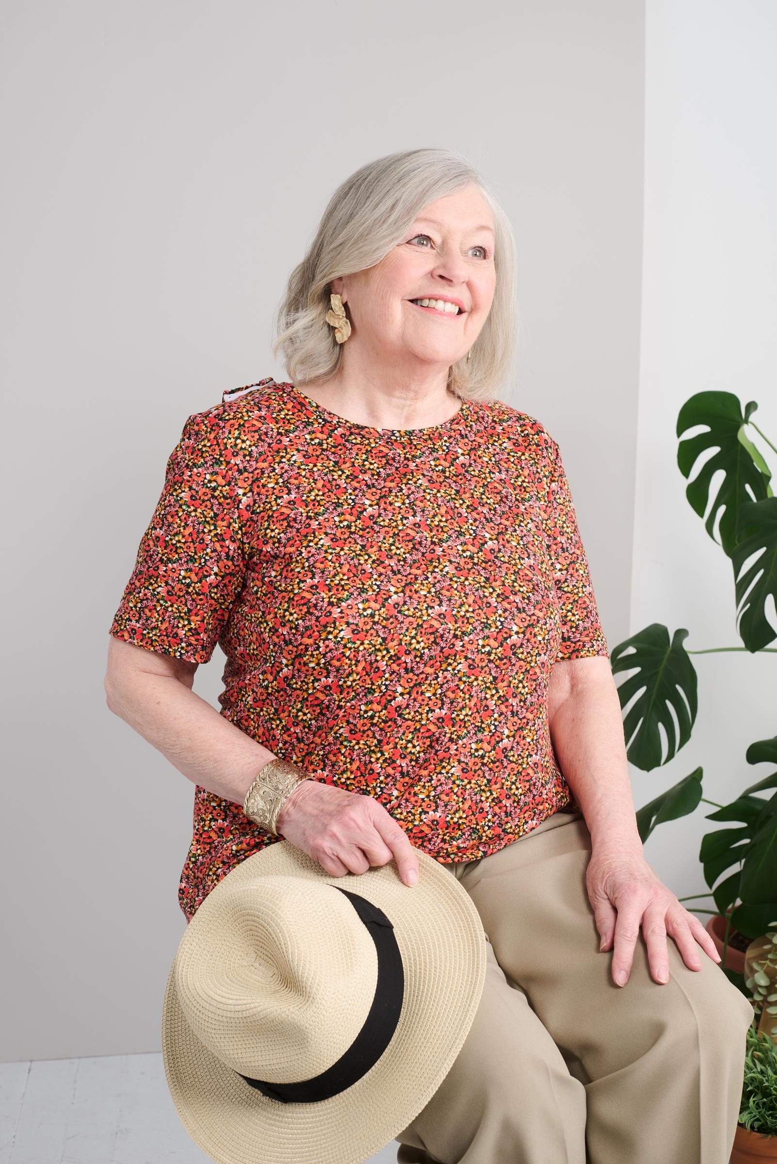 Stay comfortable and stylish with our popular t-shirt. The brushed fabric and short sleeves provide a soft feeling, while the beautiful flower pattern in coral and pink adds a touch of charm to your wardrobe. Look and feel your best with this versatile top. This the top is designed for individuals with reduced mobility, allowing it to be easily slipped on without lifting their arms or getting out of bed or a wheelchair. It is made from a blend of polyester and spandex.